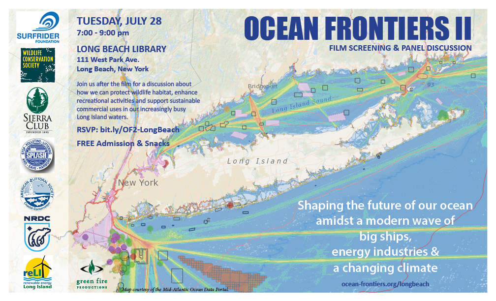 This event is hosted by Surfrider Foundation, Wildlife Conservation Society, Long Island Sierra Club, Operation SPLASH, American Littoral Society, Natural Resources Defense Council, Renewable Energy Long Island and Green Fire Productions. Special thanks to All Our Energy for spreading the word about this event!